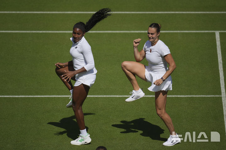 [런던=AP/뉴시스] 아리나 사발렌카(1위·벨라루스, 오른쪽)와 코코 고프(2위·미국)가 27일(현지 시간) 영국 런던 올잉글랜드 센터 코트에서 2025 윔블던을 대비해 함께 훈련한 후 춤추고 있다. 고프는 이 영상을 틱톡에 올리며 "우리 사이 좋아요"라는 문구를 적기도 했다. 2025 윔블던은 6월 30일부터 7월 13일까지 열린다. 2025.06.28.