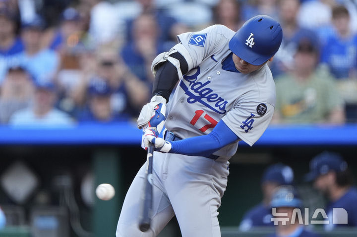 [캔자스시티=AP/뉴시스] LA 다저스의 오타니 쇼헤이가 27일(현지 시간) 미 미주리주 캔자스시티 코프먼 스타디움에서 열린 2025 메이저리그 캔자스시티 로열스와의 경기 1회 초 선두 타자로 나와 1점 홈런(29호)을 치고 있다. 2025.06.28.