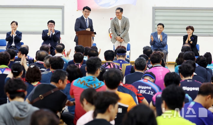 [부산=뉴시스] 하경민 기자 = 28일 부산 강서구 강서실내체육관에서 열린 '제1회 좋은병원들배 탁구대회' 개회식에 참석한 박종우(윗줄 왼쪽 세번째) 부산시탁구협회장과 구자성(왼쪽 네번째) 은성의료재단 이사장이 참가 선수들에게 인사하고 있다.