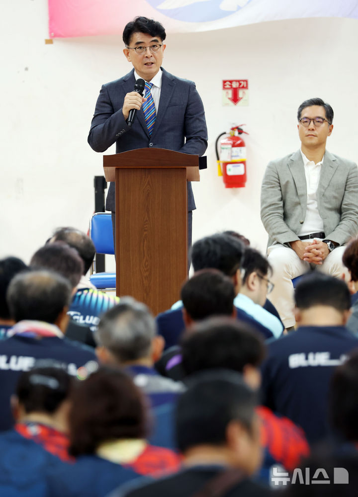 [부산=뉴시스] 하경민 기자 = 28일 부산 강서구 강서실내체육관에서 열린 '제1회 좋은병원들배 탁구대회' 개회식에 참석한 박종우 부산시탁구협회장이 개회사를 하고 있다.