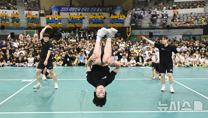 [수원=뉴시스] 김종택 기자 = 28일 경기 수원시 장안구 종합체육관에서 열린 ‘2025 대한민국 전국민 건강줄넘기대회’에서 줄넘기시범단이 멋진 공연을 펼치고 있다.