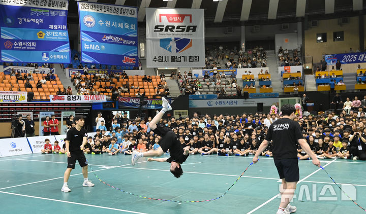 [수원=뉴시스] 김종택 기자 = 28일 경기 수원시 장안구 종합체육관에서 열린 ‘2025 대한민국 전국민 건강줄넘기대회’에서 줄넘기시범단이 멋진 공연을 펼치고 있다.
