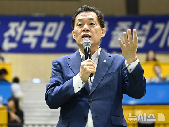 [수원=뉴시스] 김종택 기자 = 이재준 수원시장이 28일 경기 수원시 종합체육관에서 열린 ‘2025 대한민국 전국민 건강줄넘기대회’에서 축사를 하고 있다. 2025.06.28. [email protected]
