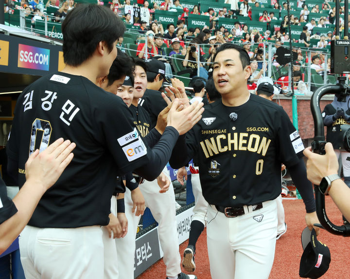 [서울=뉴시스] 이영환 기자 = 특별 엔트리로 등록된 SSG 랜더스의 김강민이 28일 인천 SSG랜더스필드에서 열린 2025 KBO리그 한화 이글스와 SSG 랜더스의 경기에서 SSG 선수들과 인사를 나누고 있다. (사진=SSG 랜더스 제공) 2025.06.28. [email protected] *재판매 및 DB 금지