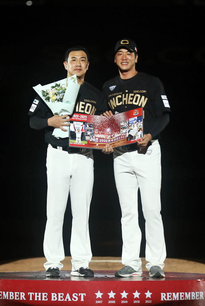 [서울=뉴시스] 이영환 기자 = 김강민이 28일 오후 인천 SSG랜더스필드에서 열린 한화 이글스와 SSG 랜더스의 경기 종료 후 진행된 은퇴식에서 김광현과 기념촬영을 하고 있다. (사진=SSG 랜더스 제공) 2025.06.28. [email protected] *재판매 및 DB 금지