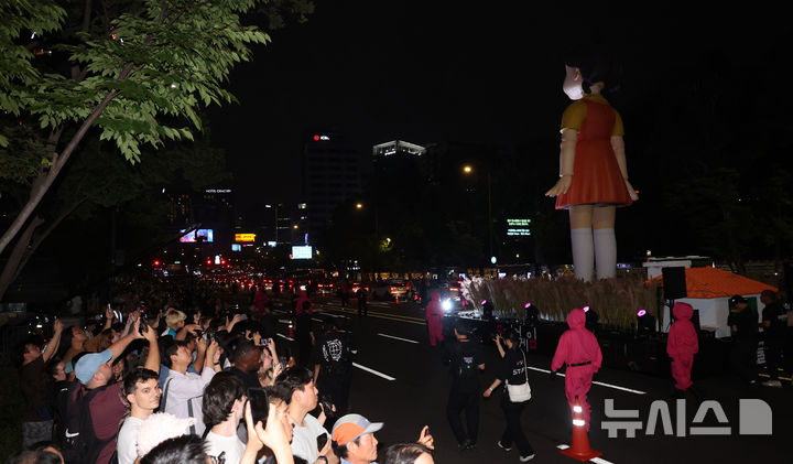 [서울=뉴시스] 권창회 기자 = 28일 서울 중구 서울시청 인근에서 2025 K콘텐츠 서울여행주간 오징어게임 퍼레이드 행사가 열리고 있다. 2025.06.28. [email protected]