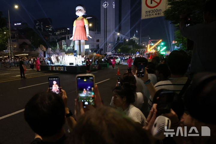 [서울=뉴시스] 권창회 기자 = 28일 서울 중구 서울시청 인근에서 2025 K콘텐츠 서울여행주간 오징어게임 퍼레이드 행사가 열리고 있다. 2025.06.28. [email protected]