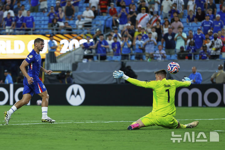[샬럿=AP/뉴시스] 첼시(잉글랜드)의 키어런 듀스버리홀(왼쪽)이 28일(현지 시간) 미 노스캐롤라이나주 샬럿의 뱅크 오브 아메리카 스타디움에서 열린 2025 국제축구연맹(FIFA) 클럽 월드컵 16강전 벤피카(포르투갈)와의 경기 연장 후반 12분 팀 4번째 골을 넣고 있다. 이날 경기는 낙뢰를 동반한 기상 악화로 약 120분 지연됐으며 첼시는 연장 후반에만 3골을 넣어 4-1로 승리하고 8강에 올랐다. 2025.06.29.