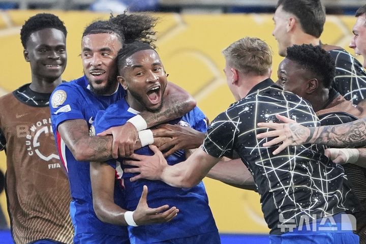 [샬럿=AP/뉴시스] 첼시(잉글랜드)의 크리스토퍼 은쿤쿠(가운데)가 28일(현지 시간) 미 노스캐롤라이나주 샬럿의 뱅크 오브 아메리카 스타디움에서 열린 2025 국제축구연맹(FIFA) 클럽 월드컵 16강전 벤피카(포르투갈)와의 경기 연장 후반 3분 추가 골을 넣고 동료들과 환호하고 있다. 이날 경기는 낙뢰를 동반한 기상 악화로 약 120분 지연됐으며 첼시는 연장 후반에 3골을 넣으며 4-1로 승리하고 8강에 올랐다. 2025.06.29.