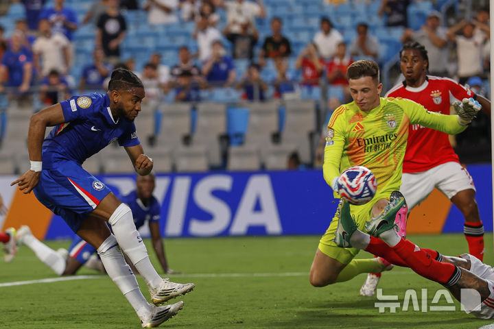 [샬럿=AP/뉴시스] 첼시(잉글랜드)의 크리스토퍼 은쿤쿠(왼쪽)가 28일(현지 시간) 미 노스캐롤라이나주 샬럿의 뱅크 오브 아메리카 스타디움에서 열린 2025 국제축구연맹(FIFA) 클럽 월드컵 16강전 벤피카(포르투갈)와의 경기 연장 후반 3분 추가 골을 넣고 있다. 이날 경기는 낙뢰를 동반한 기상 악화로 약 120분 지연됐으며 첼시는 연장 후반에만 3골을 넣어 4-1로 승리하고 8강에 올랐다. 2025.06.29.