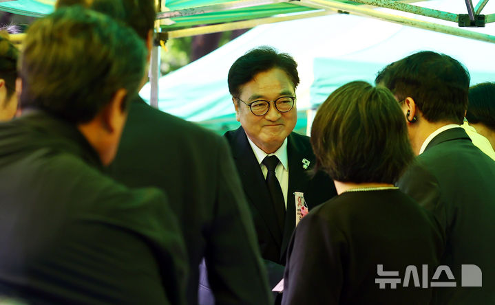 [서울=뉴시스] 박주성 기자 = 우원식 국회의장이 29일 서울 서초구 양재시민의숲 삼풍백화점 붕괴 참사 위령탑에서 열린 삼풍백화점 붕괴 참사 30주기 추모식에서 참석해 내빈들과 인사를 나누고 있다. 2025.06.29. [email protected]