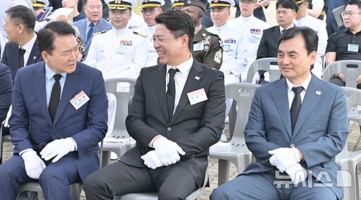 [평택=뉴시스] 황준선 기자= 안규백(오른쪽) 국방부 장관 후보자, 성일종 국회 국방위원회 위원장, 부승찬(가운데) 더불어민주당 의원이 29일 오전 평택시 해군 2함대사령부 충무동산에서 열린 '제2연평해전 승전 23주년 기념식'에서 대화를 하고 있다. (공동취재) 2025.06.29. [email protected]