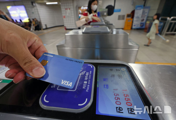 [서울=뉴시스] 조성우 기자 = 한 시민이 29일 서울 시내의 한 지하철역 개찰구에서 교통카드를 태그하고 있다. 지난 28일부터 서울·인천·경기 지하철을 탈 때 교통카드 기본요금이 기존 1400원에서 1550원으로 150원 인상됐다. 2025.06.29. [email protected]