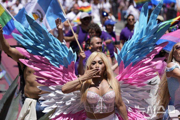[샌프란시스코=AP/뉴시스] 29일(현지 시간) 미 캘리포니아주 샌프란시스코에서 열린 프라이드 퍼레이드에서 참가자들이 행진하고 있다. 매년 6월은 '세계 성소수자 프라이드의 달'로 세계 곳곳에서 기념행사가 열린다. 2025.06.30.