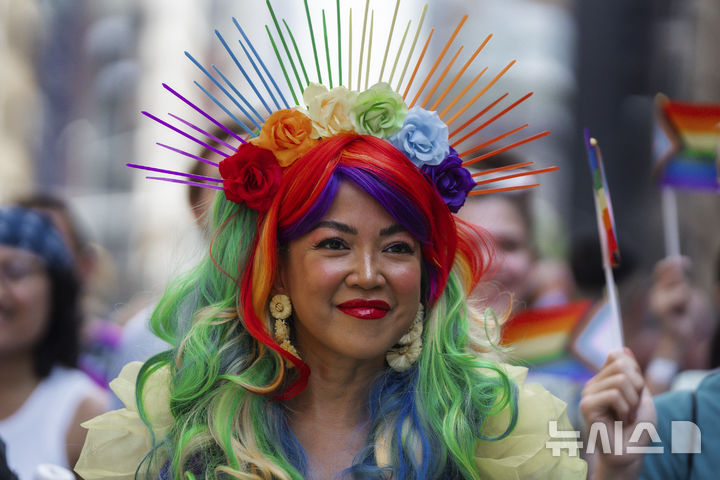 [뉴욕=AP/뉴시스] 29일(현지 시간) 미 뉴욕주 뉴욕에서 열린 프라이드 퍼레이드에서 무지개색 머리 장식을 한 참가자가 행진하고 있다. 매년 6월은 '세계 성소수자 프라이드의 달'로 세계 곳곳에서 기념행사가 열린다. 2025.06.30.