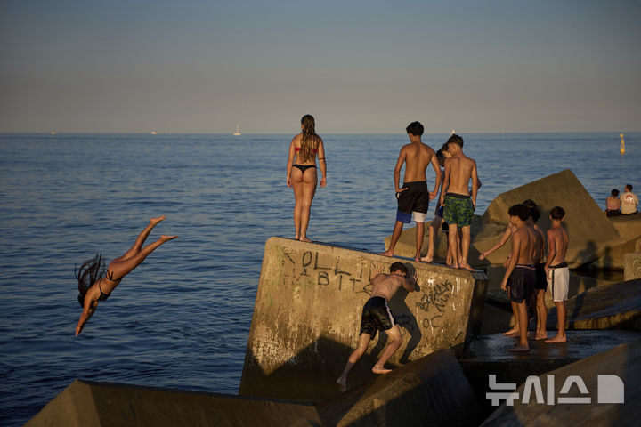 [바르셀로나=AP/뉴시스] 29일(현지 시간) 스페인 바르셀로나 인근 해변 방파제 바위에서 청소년들이 물로 뛰어들고 있다. 스페인 남부 세비야와 중부 일부 지역 기온이 42도까지 치솟는 등 찜통더위를 기록했으며 국립기상청(AEMET)은 올 6월이 가장 더운 달로 기록될 것이라고 내다봤다. 2025.06.30.