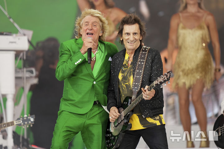 [서머싯=AP/뉴시스] 영국의 전설적인 싱어송라이터 로드 스튜어트(왼쪽)가 29일(현지 시간) 영국 서머싯주 워디팜에서 열린 2025 글래스턴베리 록 페스티벌에서 록밴드의 전설 '롤링 스톤스'의 기타리스트 로니 우드와 함께 공연하고 있다. 2025.06.30.