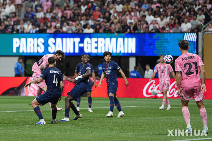 [애틀랜타=신화/뉴시스] 파리 생제르맹(PSG, 프랑스)의 이강인(가운데)이 29일(현지 시간) 미 조지아주 애틀랜타의 메르세데스-벤츠 스타디움에서 열린 2025 국제축구연맹(FIFA) 클럽 월드컵 16강전에서 인터 마이애미(미국)와 경기하고 있다. PSG가 4-0으로 승리하고 8강에 올라 바이에른 뮌헨(독일)과 4강 진출을 다툰다. 2025.06.30.