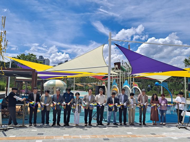 [옥천=뉴시스] 황규철 충북 옥천군수 등 옥천지역 기관단체장들이 30일 오후 옥천읍 문정리 온누리 가족공원 개장식에서 테이프를 커팅하고 있다. 옥천군은 지방소멸대응기금 등 38억원을 들여 2만1194㎡ 터에 어린이 놀이시설, 발물놀이장, 산책로, 잔디광장 등을 갖춘 가족친화형 공원을 조성했다. (사진=옥천군 제공) 2025.06.30. [email protected]