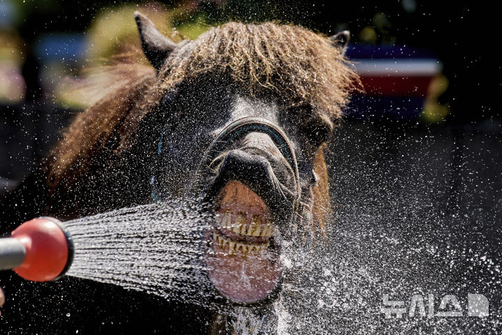 [베어하임=AP/뉴시스] 폭염이 시작된 30일(현지 시간) 독일 프랑크푸르트 인근 베어하임의 한 종마 목장에서 아이슬란드 말 한 마리가 호스에서 나오는 물을 마시고 있다. 2025.06.30.