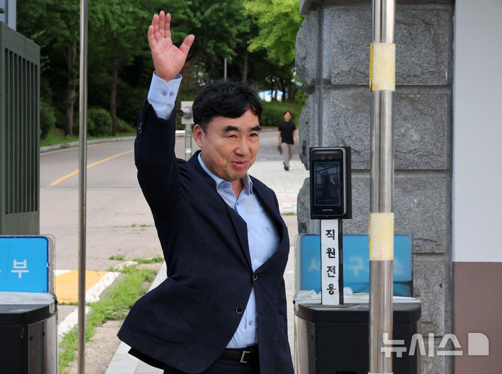[서울=뉴시스] 배훈식 기자 = 정당법 위반 혐의로 수감중이던 윤관석 전 의원이 30일 오전 1년 10개월여 만에 가석방돼 경기 의왕시 서울구치소를 나서며 지지자들을 향해 손을 흔들고 있다. 윤 전 의원은 더불어민주당 전당대회 돈봉투 사건으로 징역 2년형을 선고받고 복역했다. 2025.06.30. [email protected]