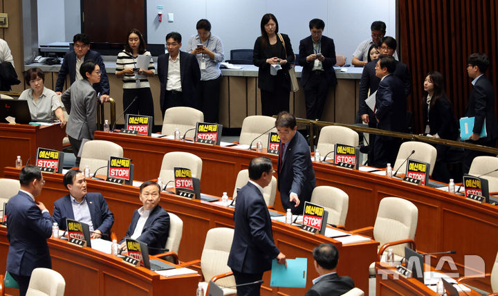 예결위 전체회의 정회 요구하며 퇴장하는 야당