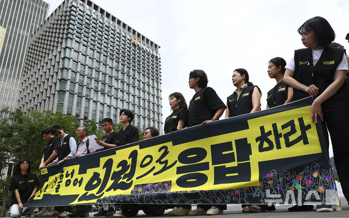 [서울=뉴시스] 김근수 기자 = 국제앰네스티 한국지부와 시민사회단체 회원들이 30일 서울 종로구 이순신동상 앞에서 열린 '12.3 계엄을 넘어 인권으로 응답하라’ 기자회견에서 손 피켓을 들고 국내 인권과제 준수 의무를 촉구하는 발언을 하고 있다. 2025.06.30. [email protected]