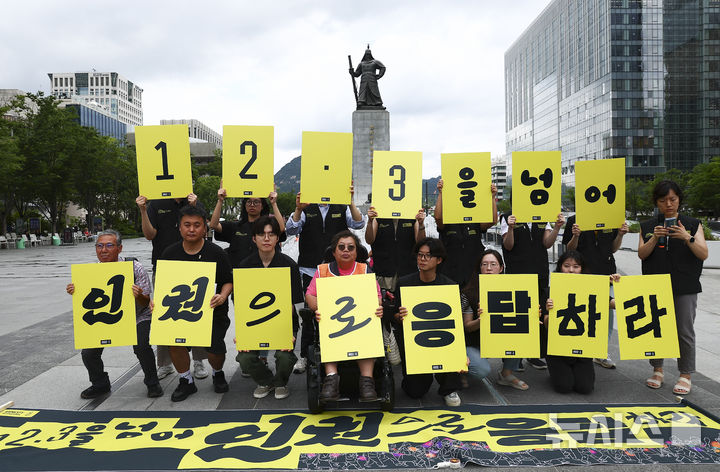 [서울=뉴시스] 김근수 기자 = 국제앰네스티 한국지부와 시민사회단체 회원들이 30일 서울 종로구 이순신동상 앞에서 열린 '12.3 계엄을 넘어 인권으로 응답하라’ 기자회견에서 손 피켓을 들고 국내 인권과제 준수 의무를 촉구하는 구호를 외치고 있다. 2025.06.30. [email protected]