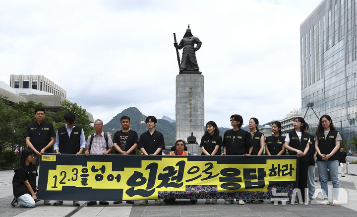 [서울=뉴시스] 김근수 기자 = 국제앰네스티 한국지부와 시민사회단체 회원들이 30일 서울 종로구 이순신동상 앞에서 열린 '12.3 계엄을 넘어 인권으로 응답하라’ 기자회견에서 손 피켓을 들고 국내 인권과제 준수 의무를 촉구하는 발언을 하고 있다. 2025.06.30. [email protected]
