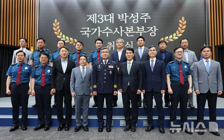[서울=뉴시스] 최진석 기자 = 박성주 신임 경찰청 국가수사본부장이 30일 서울 서대문구 경찰청에서 열린 국가수사본부장 취임식에서 기념촬영하고 있다. 2025.06.30. [email protected]