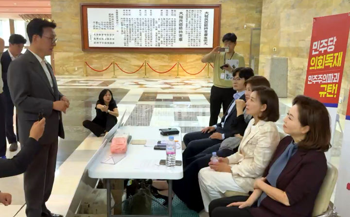 [서울=뉴시스] 조성봉 기자= 김민석(왼쪽) 국무총리 후보자가 30일 오후 서울 여의도 국회 로텐더홀에서 철야 농성 중인 나경원 국민의힘 의원과 대화를 나누고 있다. 오른쪽부터 김민전 의원. 나 의원, 김미애 의원, 박충권 의원. (사진=독자 제공)2025.06.30. [email protected]