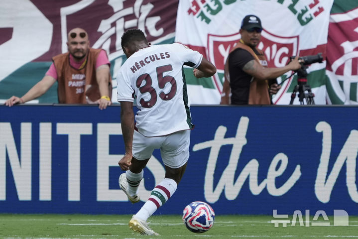 [샬럿=AP/뉴시스] 플루미넨시(브라질)의 에르쿨리스가 지난달 30일(현지 시간) 미 노스캐롤라이나주 샬럿의 뱅크 오브 아메리카 스타디움에서 열린 2025 국제축구연맹(FIFA) 클럽 월드컵 16강전 인테르 밀란(이탈리아)과 경기 후반 추가 시간 쐐기 골을 넣고 있다. 고 있다. 플루미넨시가 2-0으로 완승하고 8강에 올랐다. 2025.07.01.