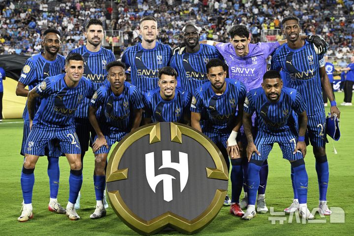 [올랜도=AP/뉴시스] 알힐랄(사우디) 선수들이 지난달 30일(현지 시간) 미 플로리다주 올랜도 캠핑 월드 스타디움에서 열린 2025 국제축구연맹(FIFA) 클럽 월드컵 16강전 맨체스터 시티(잉글랜드)와의 경기에 앞서 기념 촬영하고 있다. 알힐랄이 연장 끝 4-3으로 승리하고 8강에 올라 인테르 밀란(이탈리아)을 2-0으로 꺾은 플루미넨시(브라질)와 4강 진출을 다툰다. 2025.07.01.