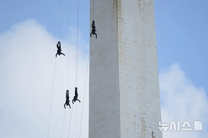 [자카르타=AP/뉴시스] 1일(현지 시간) 인도네시아 자카르타에서 인도네시아 국가경찰(POLRI) 창설 79주년 기념행사가 열려 경찰 기동타격대 '브리모브' 대원들이 밧줄을 타고 국가기념탑 하강 시범을 보여주고 있다. 인도네시아는 1946년 7월 1일, 국가경찰을 내무부 산하에서 독립시켜 국가 치안을 담당하는 대통령 직속 기관으로 재편했다. 2025.07.01.
