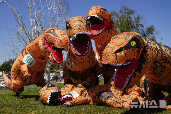 [오번=AP/뉴시스] 지난달 29일(현지 시간) 미 워싱턴주 오번의 에메랄드다운스에서 열린 '티라노사우루스 렉스(T-렉스) 선수권 대회' 참가자들이 공룡 탈을 벗고 땅에 누워 있는 친구를 잡아먹는 흉내를 내며 포즈를 취하고 있다. 이 대회는 공룡 탈을 쓴 참가자들이 100야드(약 91m)를 달리는 연례 이벤트성 행사다. 2025.07.01.