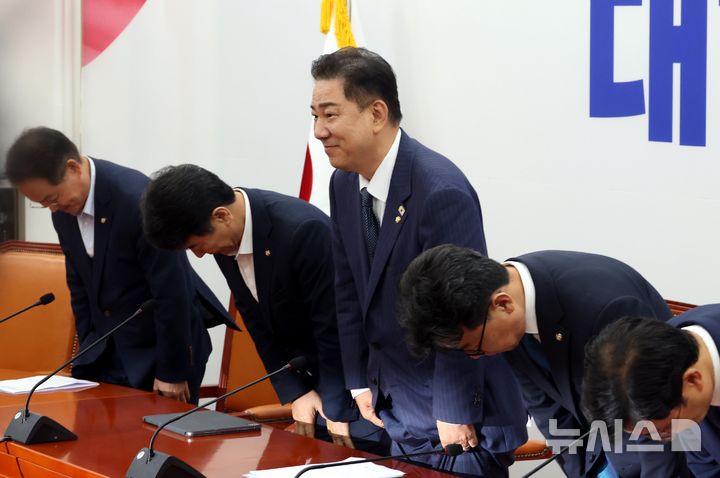 [서울=뉴시스] 조성봉 기자= 김병기 더불어민주당 당대표 직무대행 겸 원내대표와 참석자들이 1일 오전 서울 여의도 국회에서 열린 원내대책회의에 앞서 고개숙여 인사하고 있다. 2025.07.01. [email protected]