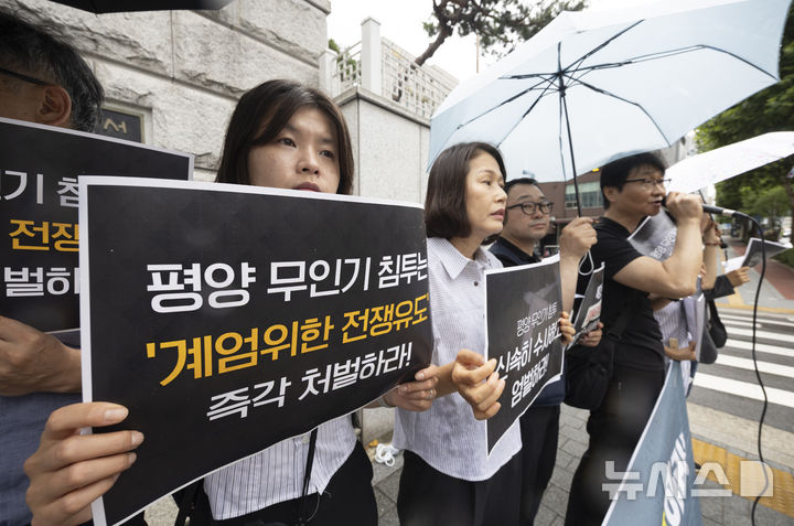 [서울=뉴시스] 김근수 기자 = 자유통일평화연대 회원들이 1일 서울 서초구 서울고등검찰청 앞에서 열린 '특검, 평양 무인기 침투 등 외환죄 수사 촉구’ 공동 기자회견에서 외환죄 수사를 요구하는 손 피켓을 들고 서 있다. 2025.07.01. [email protected]