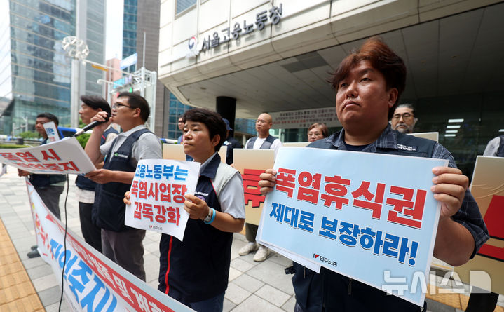 [서울=뉴시스] 김선웅 기자 = 전국민주노동조합총연맹(민주노총이) 1일 서울 중구 서울고용노동청 앞에서 폭염감시단 발족 기자회견을 열고 활동 및 폭염 시 노동자 보호 대책 등 발표, 폭염 휴식권 보장, 폭염 사업장 감독 강화 등을 촉구하고 있다. 2025.07.01. [email protected]