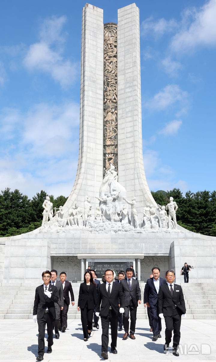 [대전=뉴시스] 강종민 기자 = 이명현 순직해병 특검팀이 정식 수사 개시를 하루 앞둔 1일 대전 유성구 국립대전현충원을 찾아 참배하고 있다. 2025.07.01. [email protected]