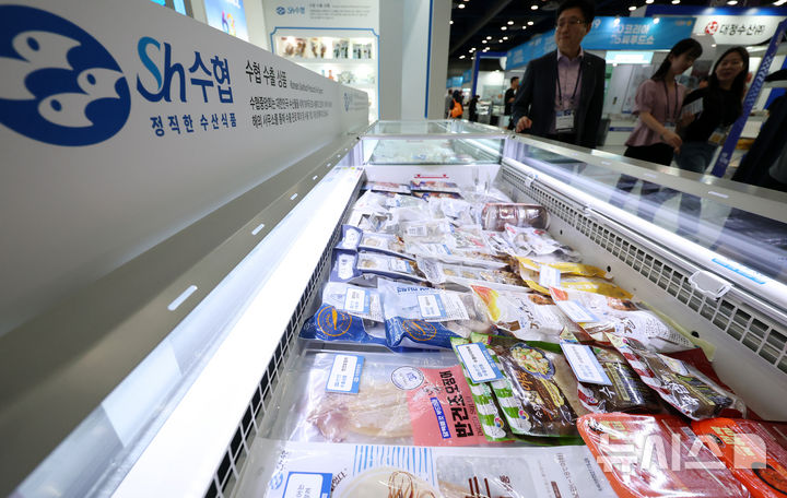 [서울=뉴시스] 이영환 기자 = 1일 오전 서울 강남구 코엑스에서 열린 2025 코리아씨푸드쇼 수협중앙회 부스에 수출 상품들이 진열되어 있다. 2025.07.01. [email protected]