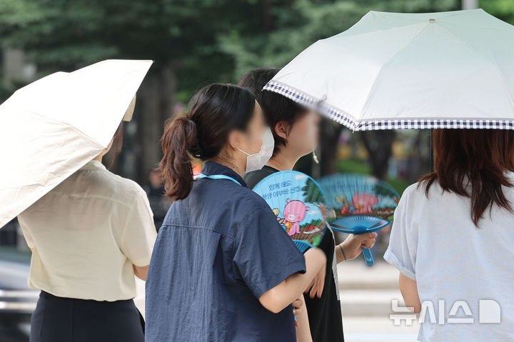 [서울=뉴시스] 권창회 기자 = 서울지역에 이틀째 폭염주의보가 지속중인 1일 서울 종로구 광화문광장 인근에서 시민들이 양산과 부채로 더위를 식히고 있다. 2025.07.01. [email protected]