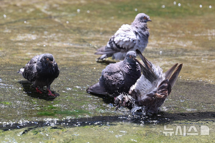 [서울=뉴시스] 권창회 기자 = 서울지역에 이틀째 폭염주의보가 지속중인 1일 서울 중구 청계천 인근에서 비둘기가 물놀이를 하고 있다. 2025.07.01. [email protected]