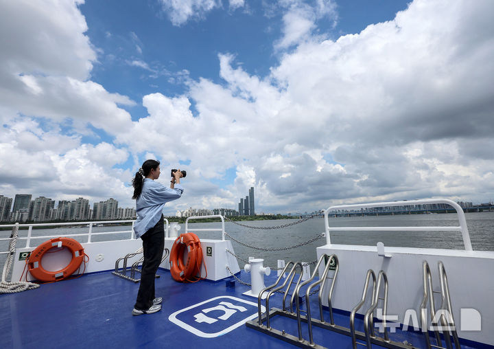 [서울=뉴시스] 김선웅 기자 = 1일 서울 여의도 선착장을 출발해 잠실 방면으로 운항하는 한강버스에 탑승한 시민 체험단이 한강변 풍경을 바라보며 사진을 촬영하고 있다.