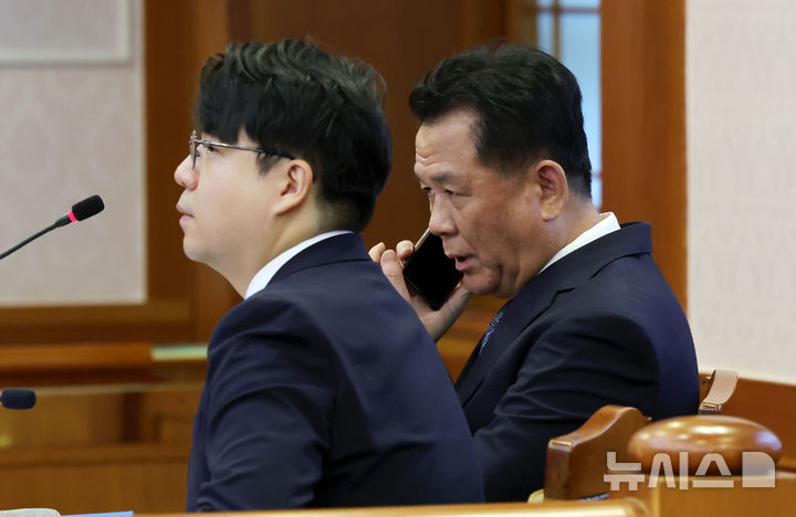 [서울=뉴시스] 홍효식 기자 = 1일 오후 서울 종로구 헌법재판소 소심판정에서 열린 조지호 경찰청장 탄핵심판 변론준비기일에 조 청장 법률대리인인 노정환(오른쪽) 변호사가 누군가와 통화하고 있다. 2025.07.01. [email protected]