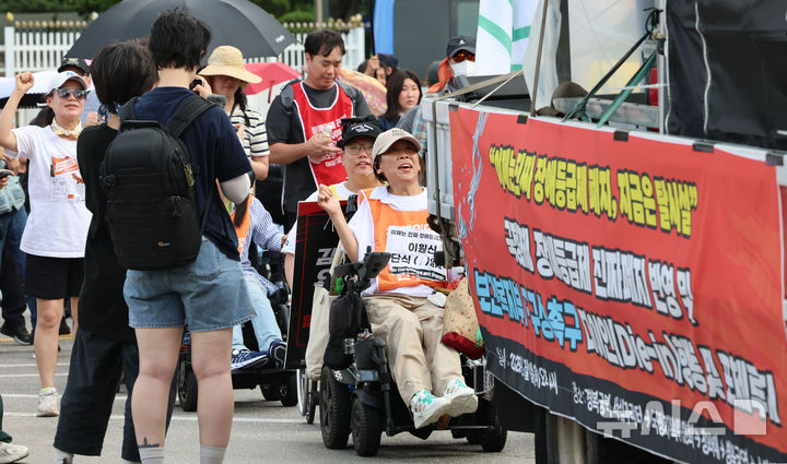 [서울=뉴시스] 권창회 기자 = 전국장애인차별철폐연대 회원들이 1일 오후 서울 종로구 경복궁역 인근에서 열린 2025 제7회 장애등급제 진짜폐지 결의대회를 마치고 국정기획위원회로 행진하고 있다. 2025.07.01. [email protected]