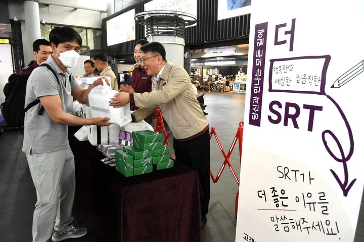 [서울=뉴시스] 김진아 기자 = 심영주(오른쪽 첫번째) 에스알 부사장이 1일 서울 강남구 수서역에서 새로운 유니폼을 입고 고객을 만나는 첫 날을 기념해 열린 고객 참여행사에서 기념품을 전달하고 있다. (사진=SRT 제공) 2025.07.01. [email protected]