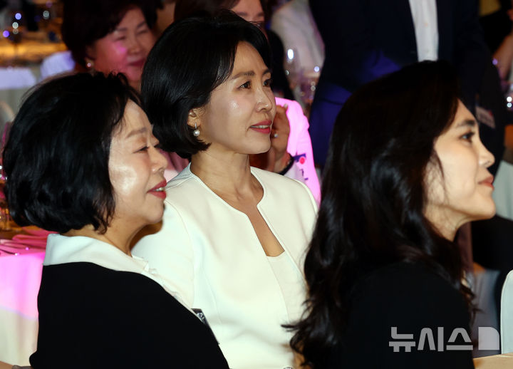 [서울=뉴시스] 박주성 기자 = 이재명 대통령 부인 김혜경 여사와 박창숙 한국경제인협회 회장이 1일 서울 중구 서울신라호텔 2층 다이너스티 홀에서 열린 제4회 여성기업주간 개막식에 참석하고 있다. 2025.07.01. [email protected]