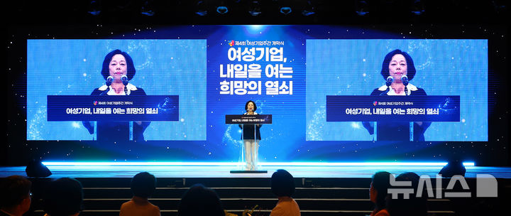 [서울=뉴시스] 박주성 기자 = 박창숙 한국경제인협회 회장이 1일 서울 중구 서울신라호텔 2층 다이너스티 홀에서 열린 제4회 여성기업주간 개막식에서 개회사를 하고 있다. 2025.07.01. [email protected]
