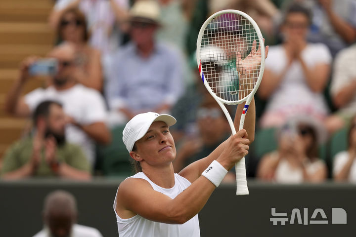 [런던=AP/뉴시스] 이가 시비옹테크(4위·폴란드)가 1일(현지 시간) 영국 런던 올잉글랜드 클럽에서 열린 2025 윔블던 테니스 대회 여자 단식 1회전에서 폴리나 쿠데르메토바(64위·러시아)를 물리친 후 세리머니하고 있다. 시비옹테크가 2-0(7-5 6-1)으로 승리하고 2회전에 올랐다. 2025.07.02.