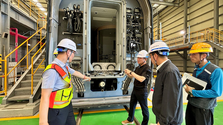 [울산=뉴시스] 김양수 기자 = 한문희(오른쪽 세번째) 코레일 사장이 2일 울산차량사업소를 찾아 열차 냉방장치와 공조기 등 폭염대비 차량 정비현황을 점검하고 있다.